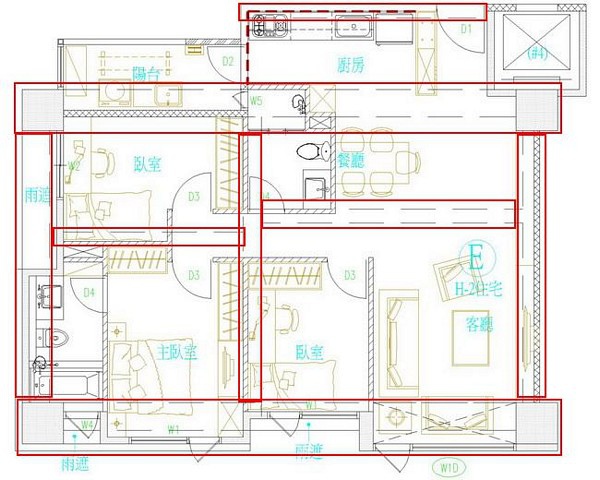 家配圖通常會標示柱子位置,但卻少畫出樑的位置,除了可以跟建商在要墨線圖再行比對,其實柱子相連為樑的位置,可試畫大概樑的走向,看看是否有壓床情形,在意風水問題可考慮未來家具擺設位置
